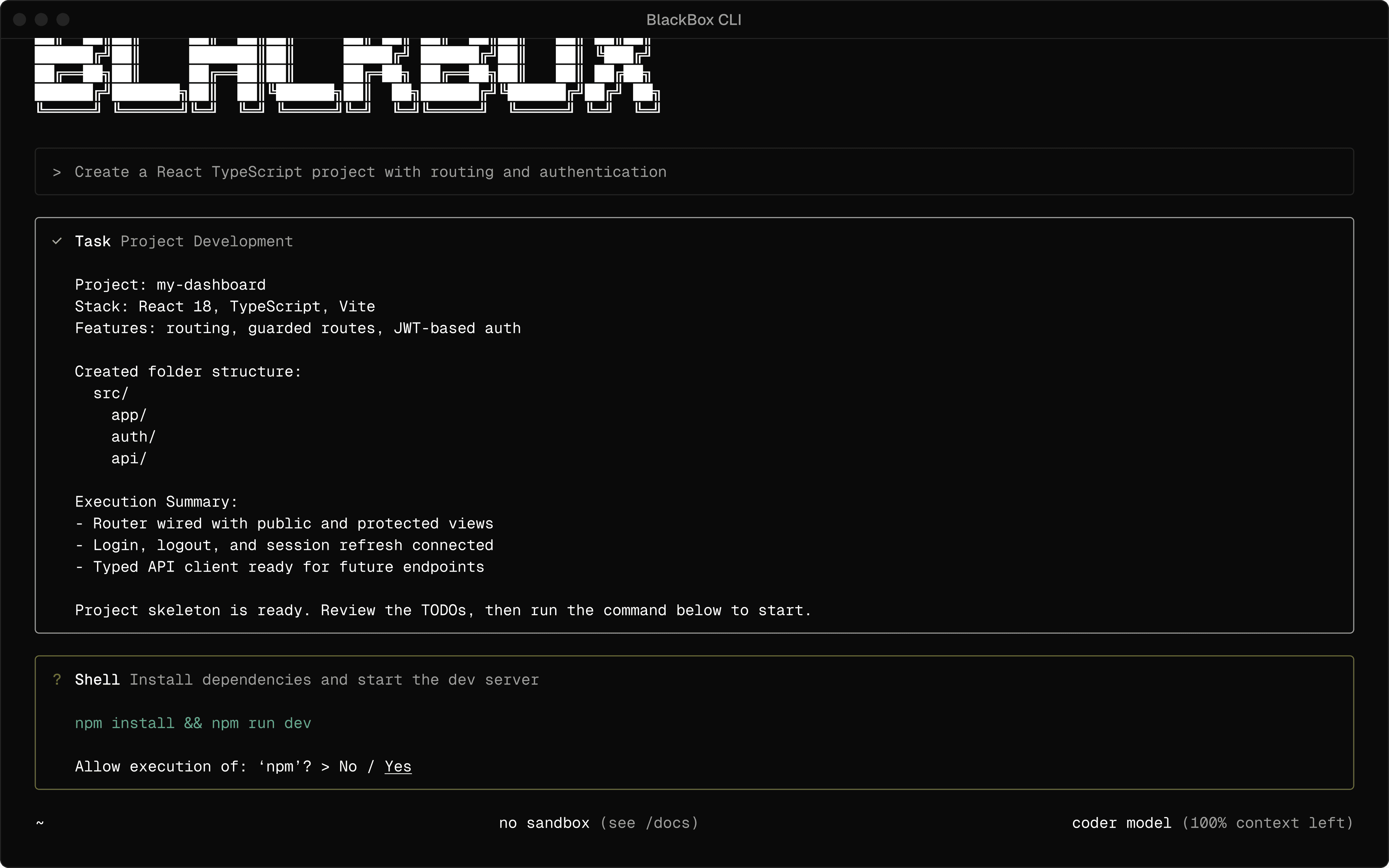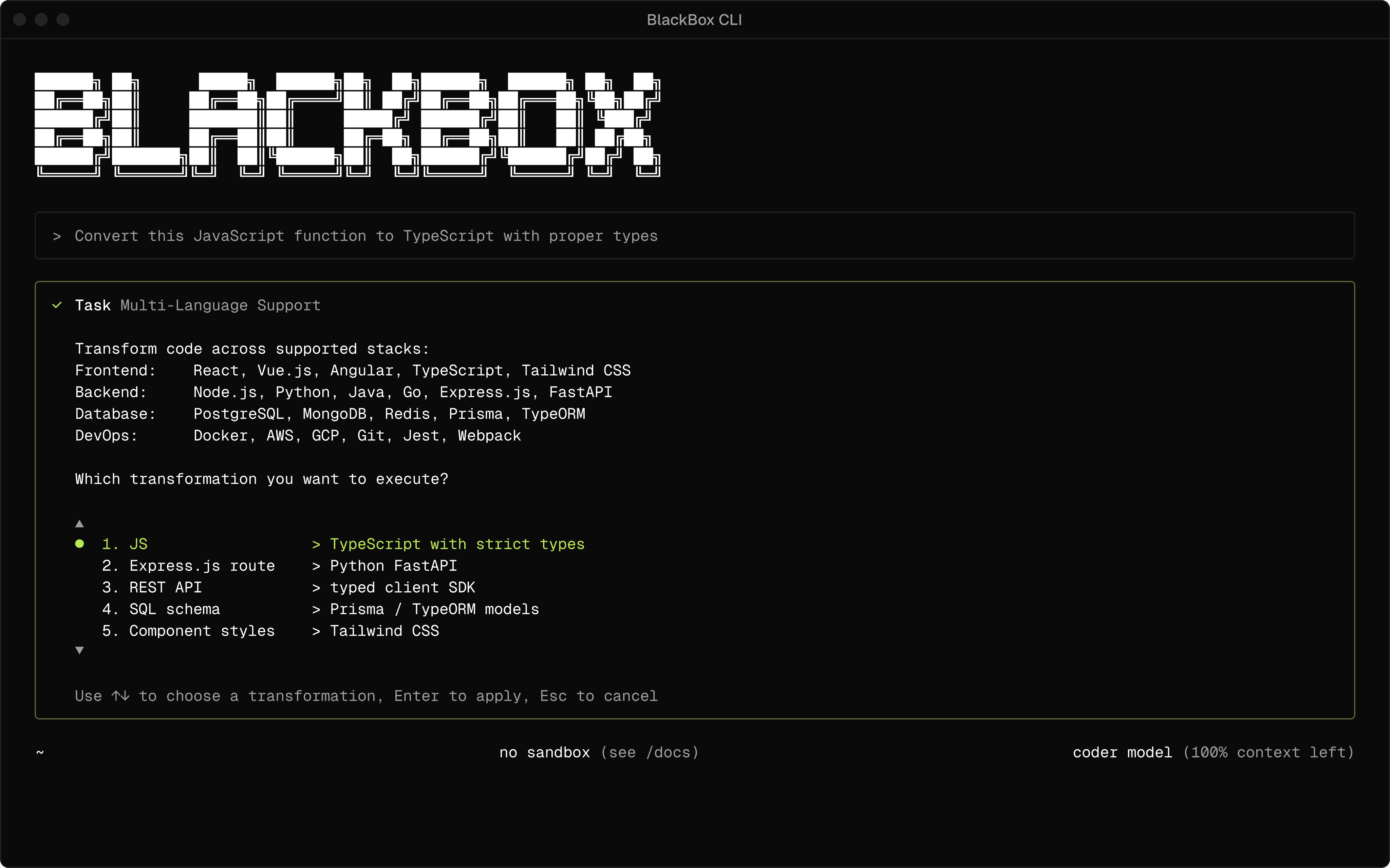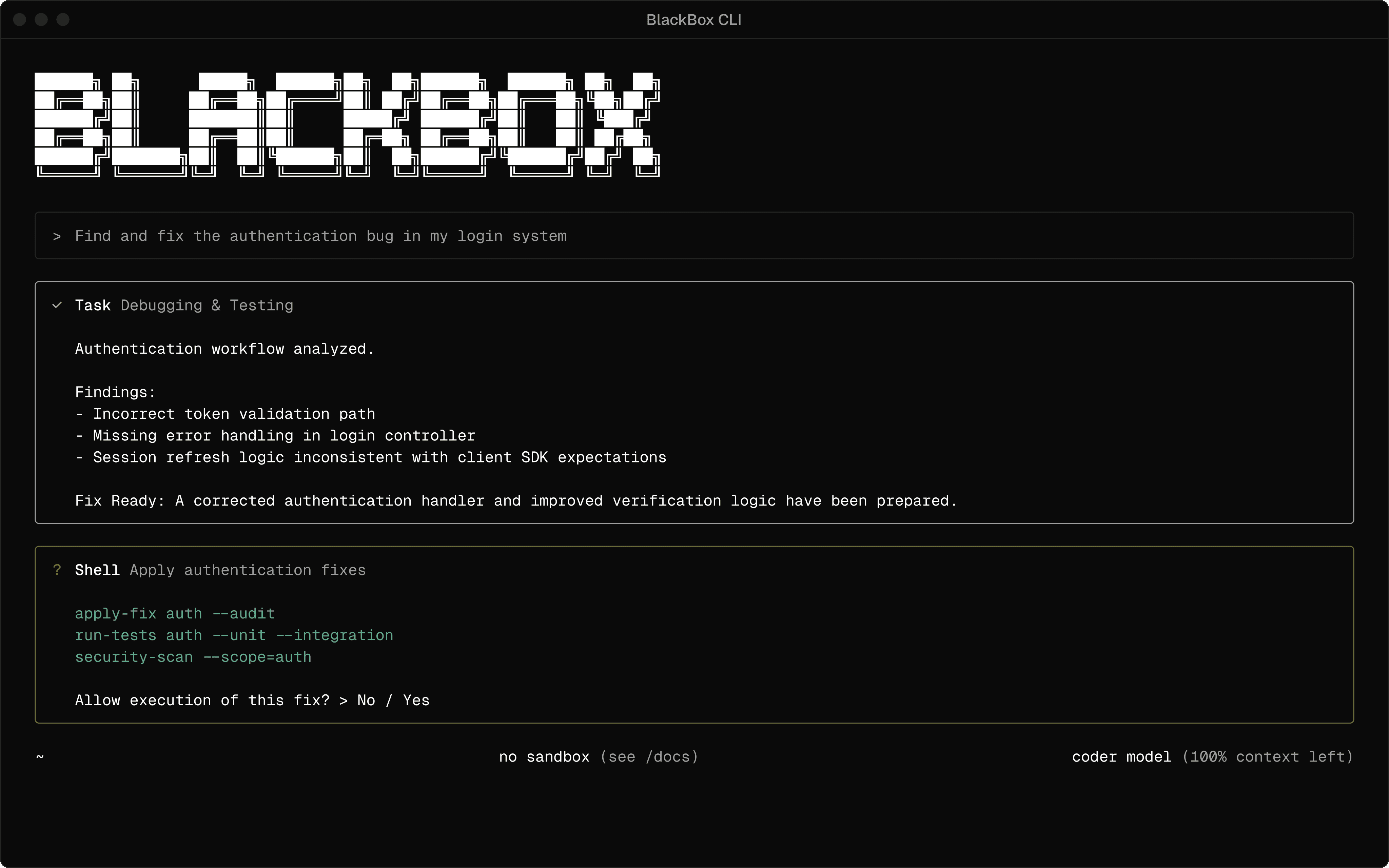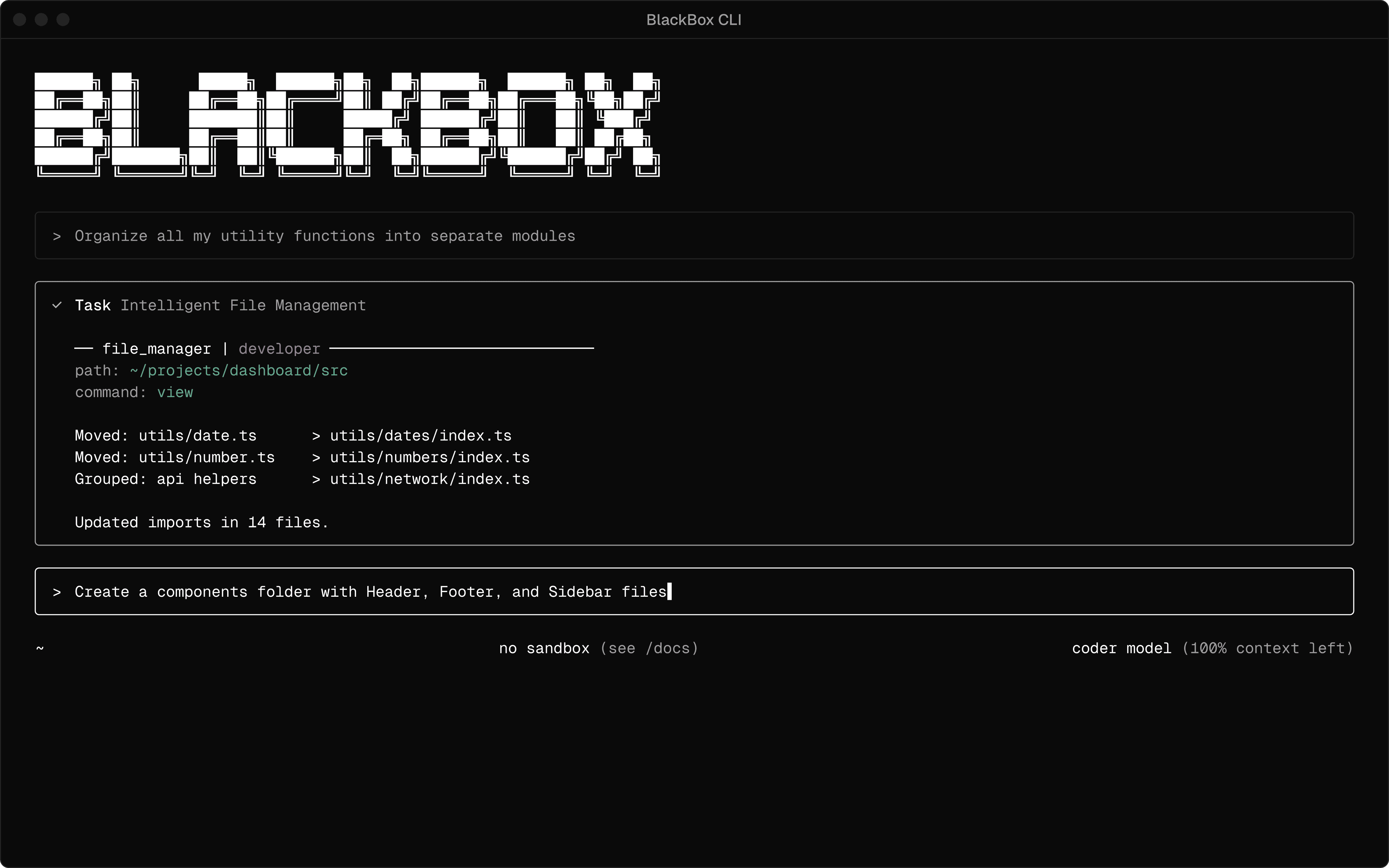 The BlackBox CLI lets you run AI requests from the terminal and apply results directly to your codebase.