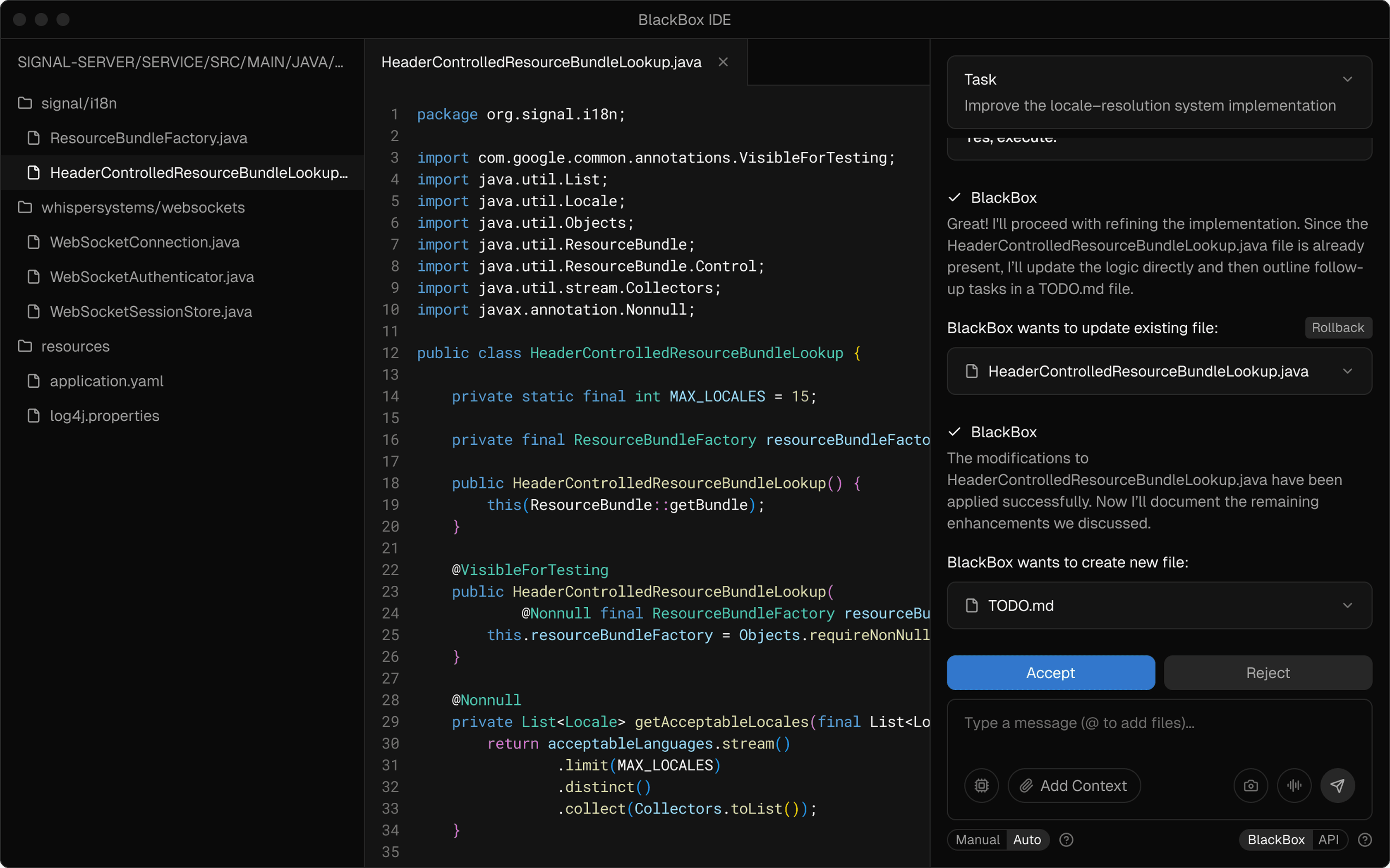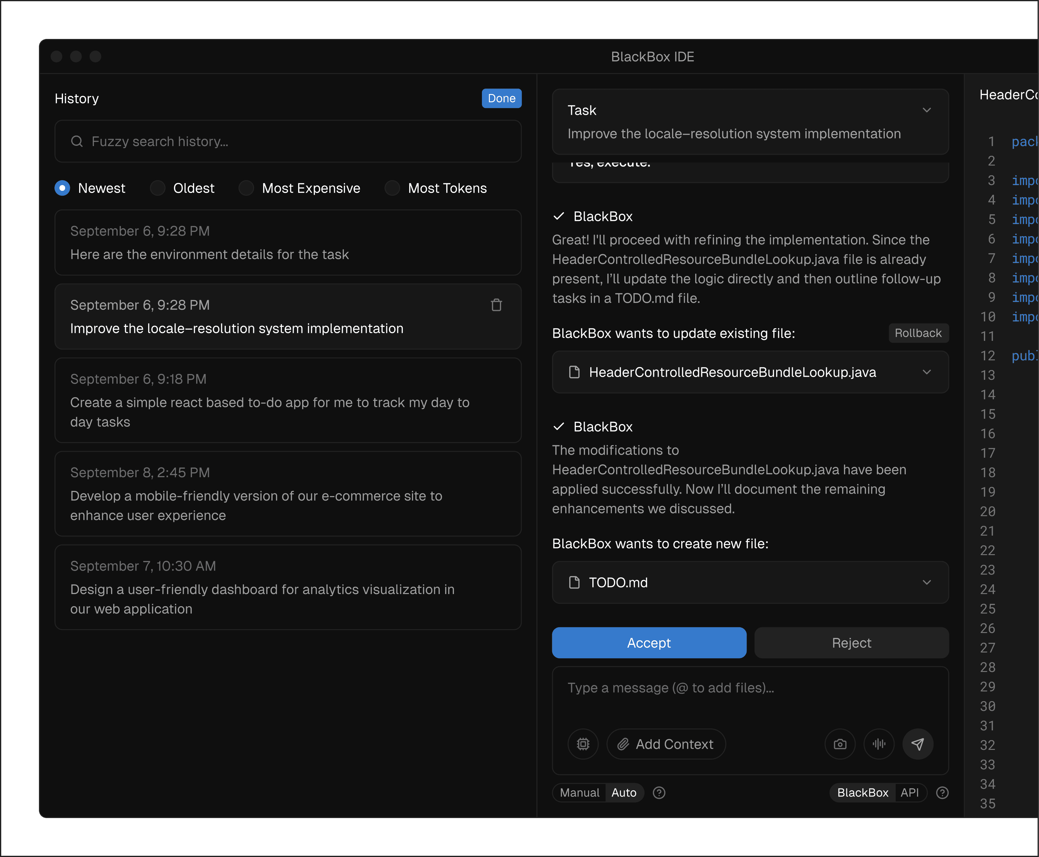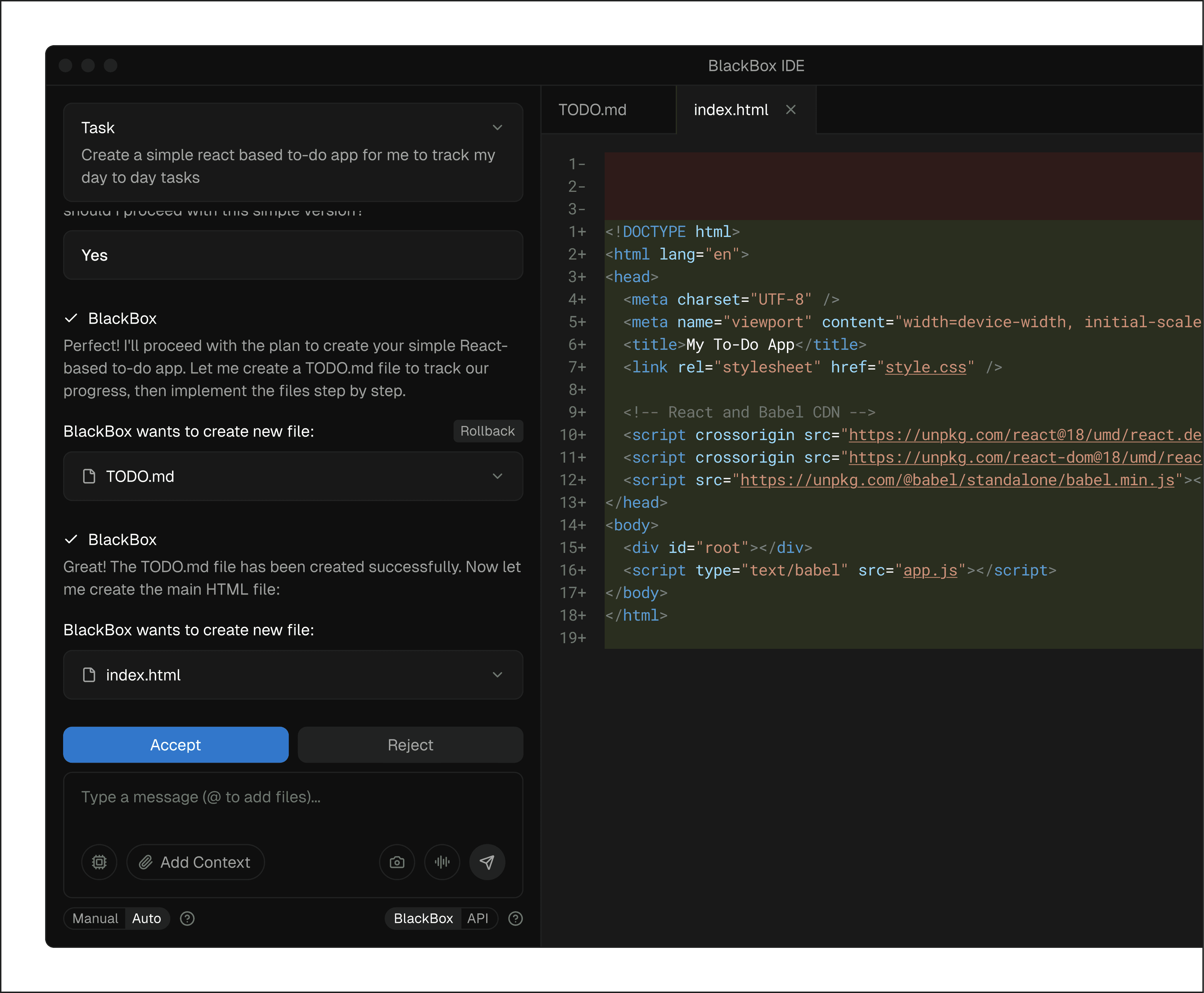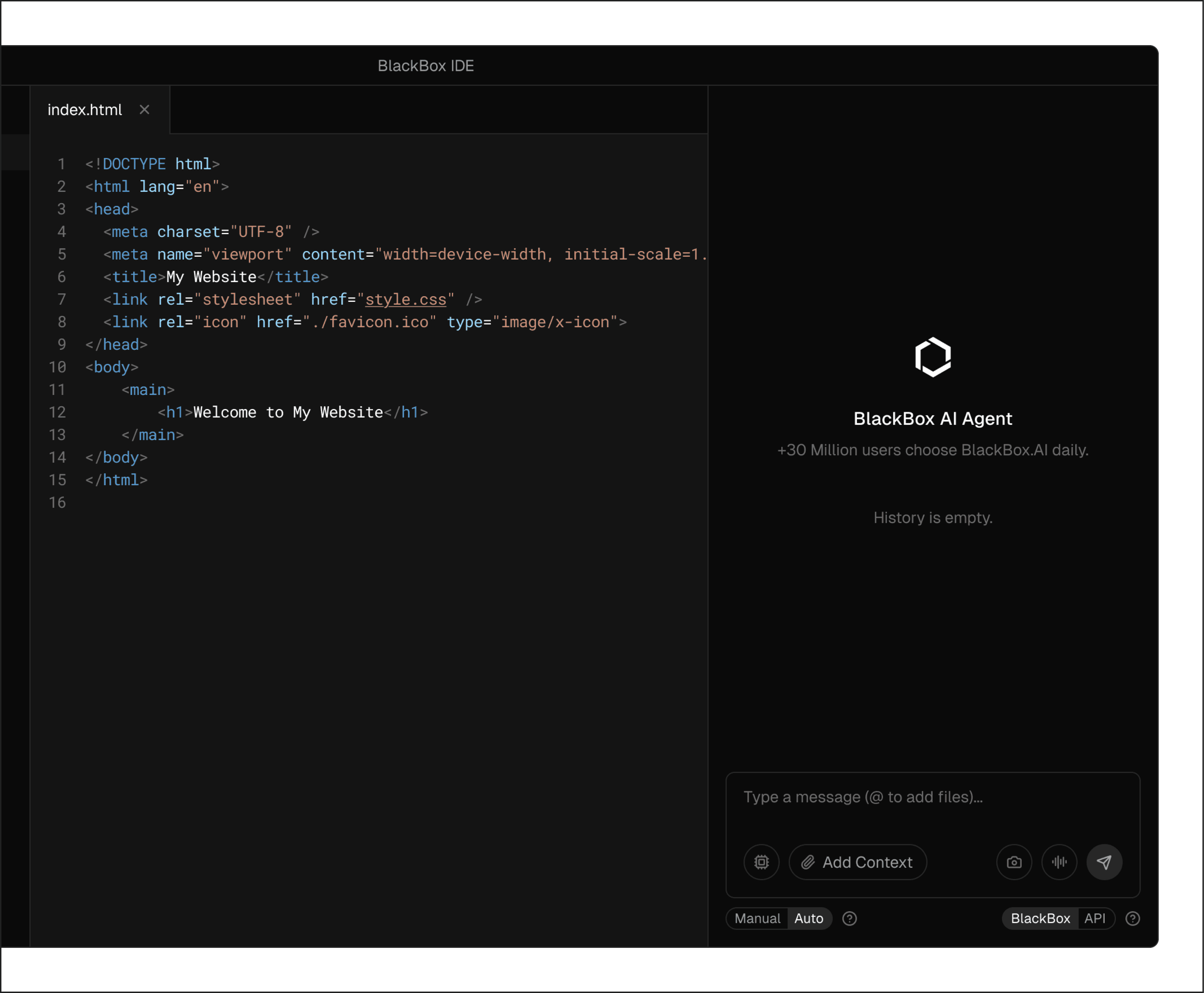 BlackBox AI IDE brings AI into your editor so you can work directly with your code. It understands your project structure, helps you generate and edit code, and answers questions using the files you already have.